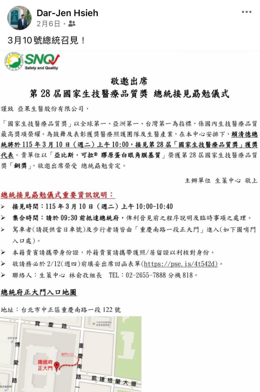 3.亞果生醫董事長(謝達仁博士)接受(賴總統)接見勗勉(眼角膜基質)產品獲得(第28屆)國家(生技醫療)品質獎(銅獎)~